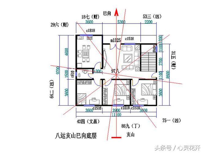 阳宅以门为气口,九运亥山巳向最佳的开门位置首选东南巽宫向位、由于九紫当旺,大门开在东南方能最直接吸纳九紫财星之气。