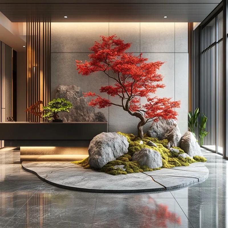 室内红枫常伴有山石、2026年,山石的选择以太湖石或灵璧石为佳、这些石头多孔穴,能藏风聚气。