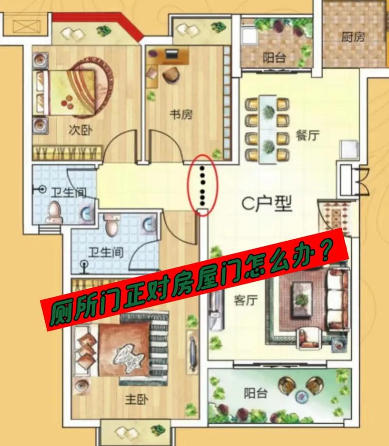 2. 马桶对门: 这是极差的布局、马桶是排泄之所,正对门会导致财气外流、如果无法移动马桶,建议在门与马桶之间挂一道帘子或设置一个小屏风。