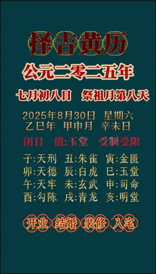 审视当日的“宜”与“忌”,我们可以清晰地看到,“入宅”与“移徙”二事赫然列于“所宜”之中、这为“8月30号能否搬家”这个问题,提供了最为直接且肯定的答案、不仅如此,开市、动土、修造等与家宅兴旺相关的活动也都在吉利范围之内,说明这一天的气场非常适合与“家”有关的崭新开始。