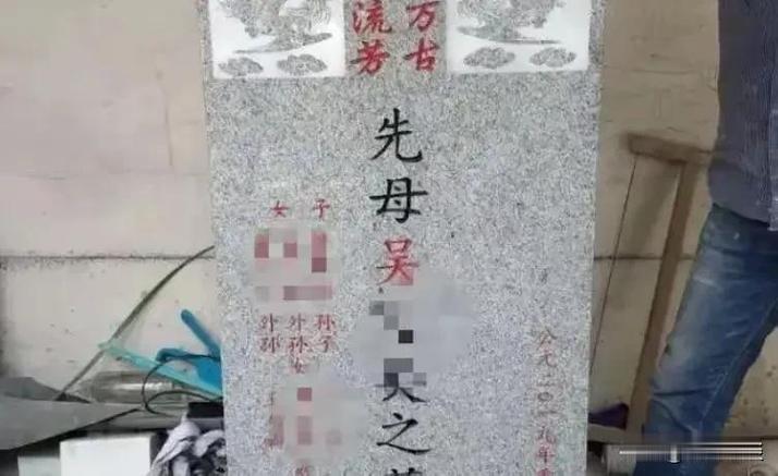 在灰色墓碑上,红色字体(朱砂红)常用于生者(如合葬墓中尚在世的一方),黑色或金字用于逝者。