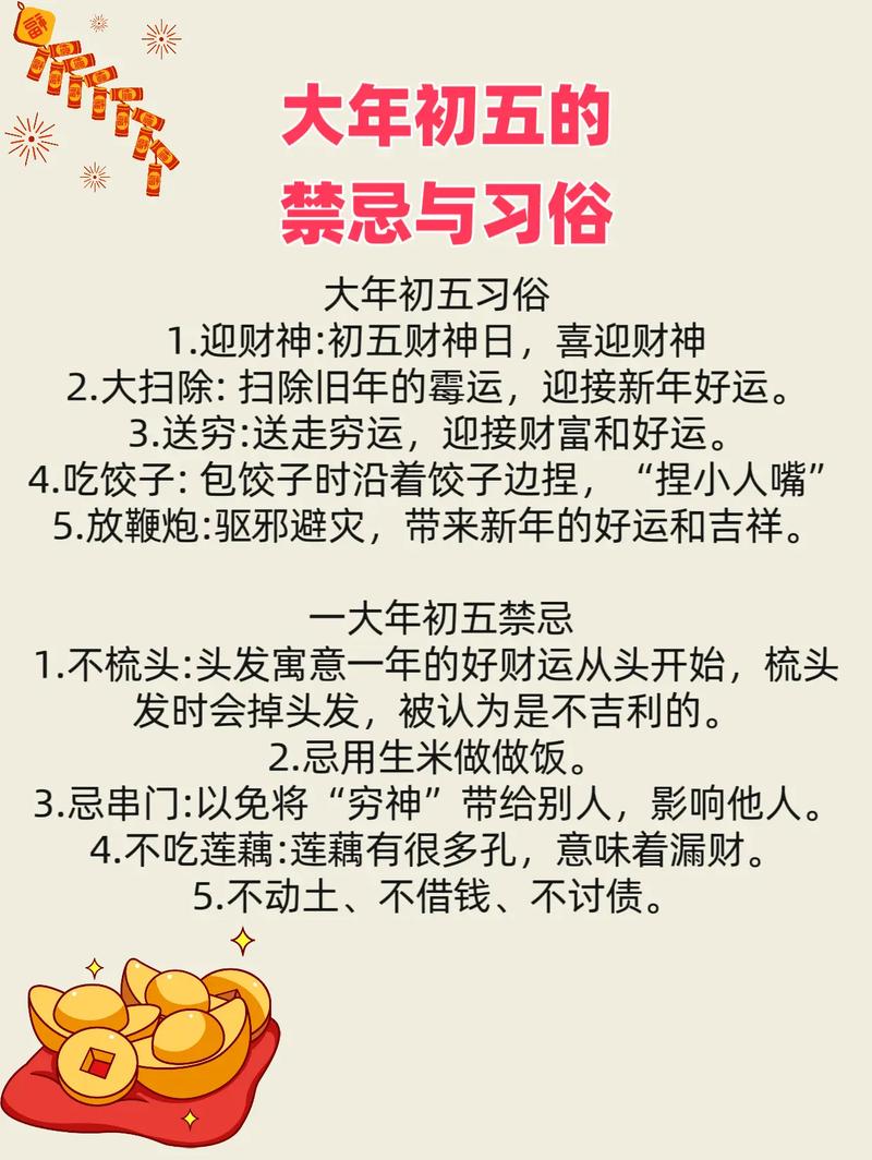 1. 初五不走亲戚: 这一天财神下凡,全家人应团聚在家,这叫“守财”、去别人家串门,容易把自家的财气带走。
