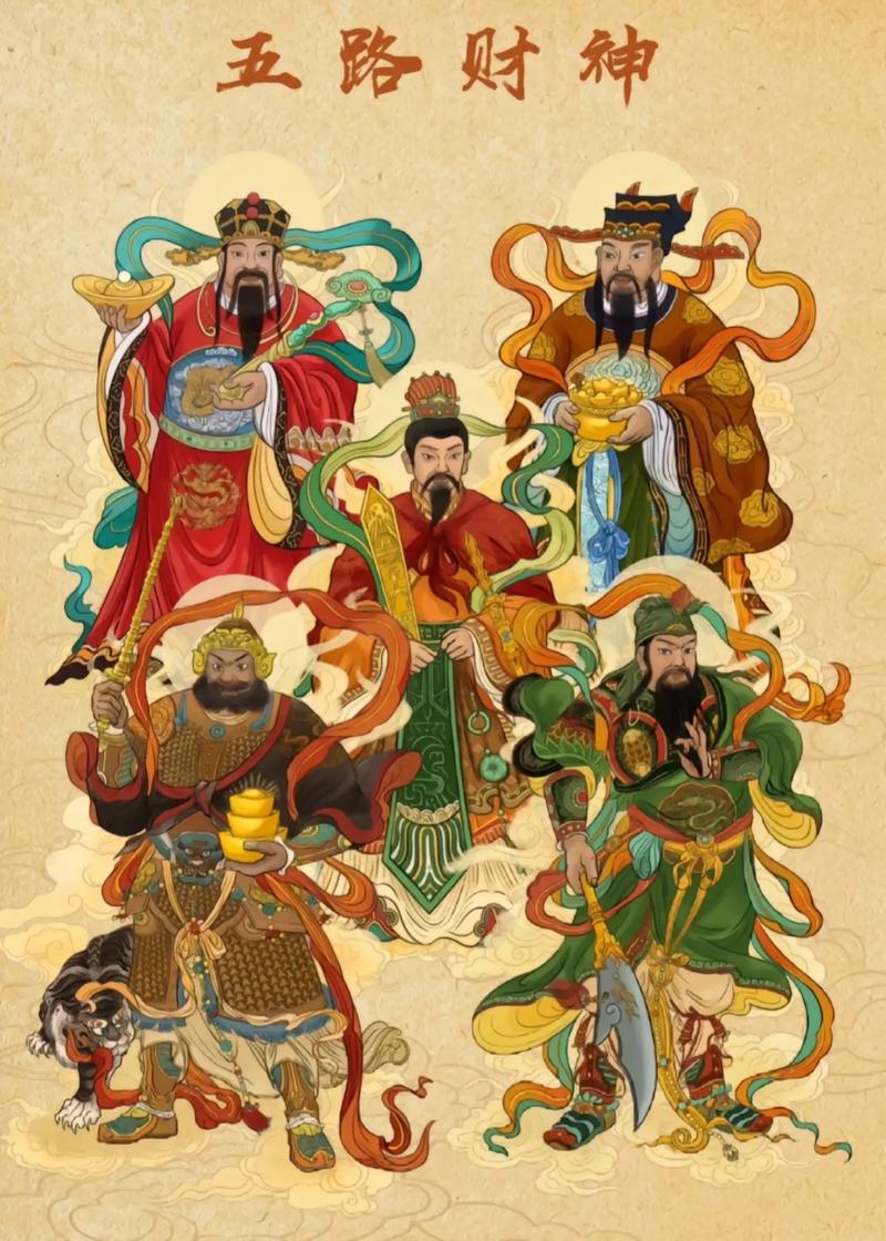 五路财神,核心首领为玄坛真君赵公明,其率领麾下四位招祥纳珍的正神:招宝天尊萧升(东路)、纳珍天尊曹宝(西路)、招财使者陈九公(南路)、利市仙官姚少司(北路)、这五位神明构成的财富矩阵,覆盖了偏财、正财、贸易之财与守成之财、在丙午年这种火性极大的年份,财星极易被“焚化”,祭拜五路财神不仅是为了求财,更是为了“镇财”与“化财为金”。