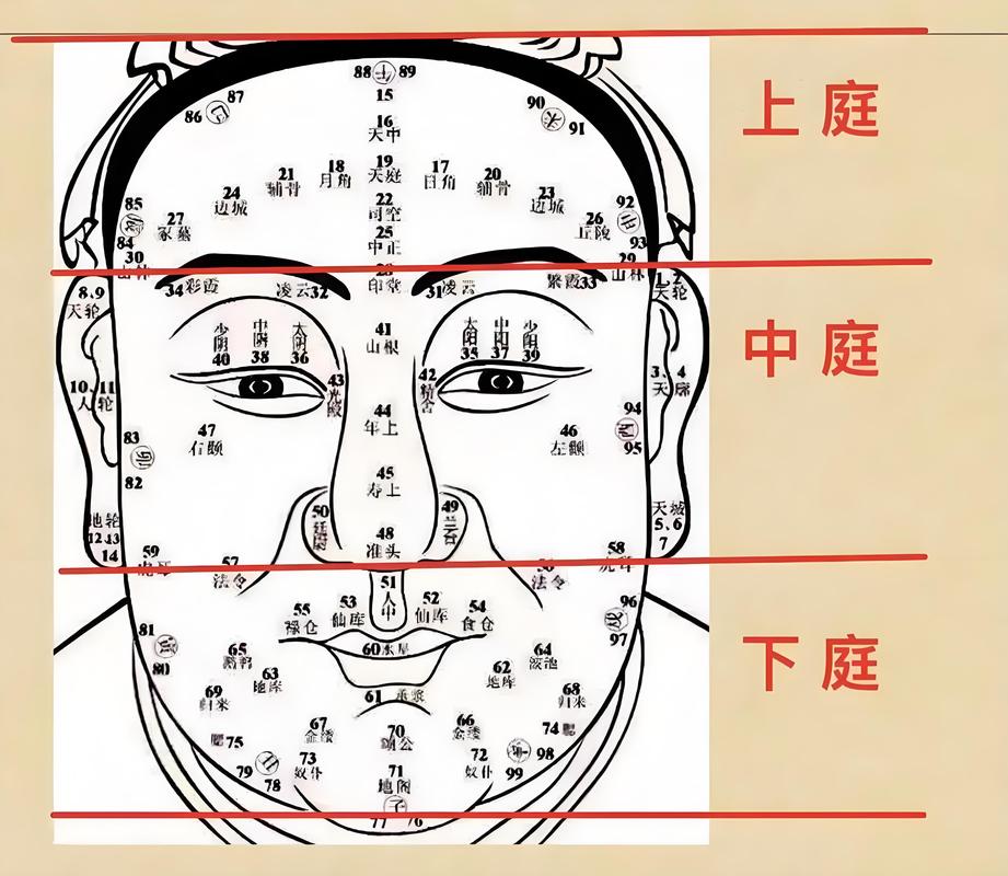 面相学将人脸横向分为三部分、上停由发际线至眉毛,主早年运势及祖荫;中停由眉毛至鼻尖,主中年拼搏与财帛;下停由鼻尖至地阁(下巴),主晚年归宿与蓄财。