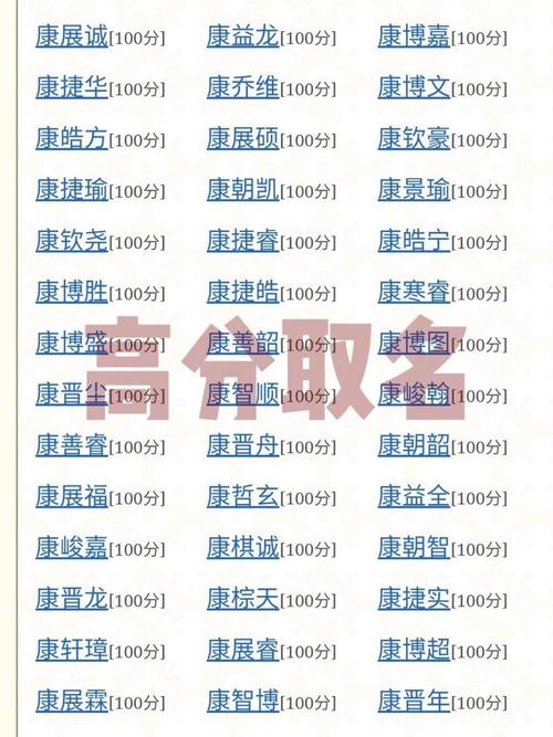 1. 谐音检查:康姓容易产生谐音,如“康希”(空气)、“康乐”(虽然好听但略显普通)、要避开如“康门”、“康货”之类的尴尬谐音。
