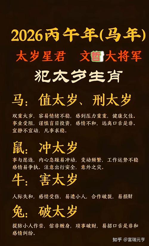 2026年丙午太岁当值,对于犯太岁的生肖而言,确实是充满挑战的一年、但挑战之中,亦蕴藏着成长的契机、只要心存敬畏,顺应天道,积极应对,善加化解,便能转危为安,甚至借势而上,迎来属于自己的光明、流年易逝,人生无常,掌握运势规律,乃是智者所为。