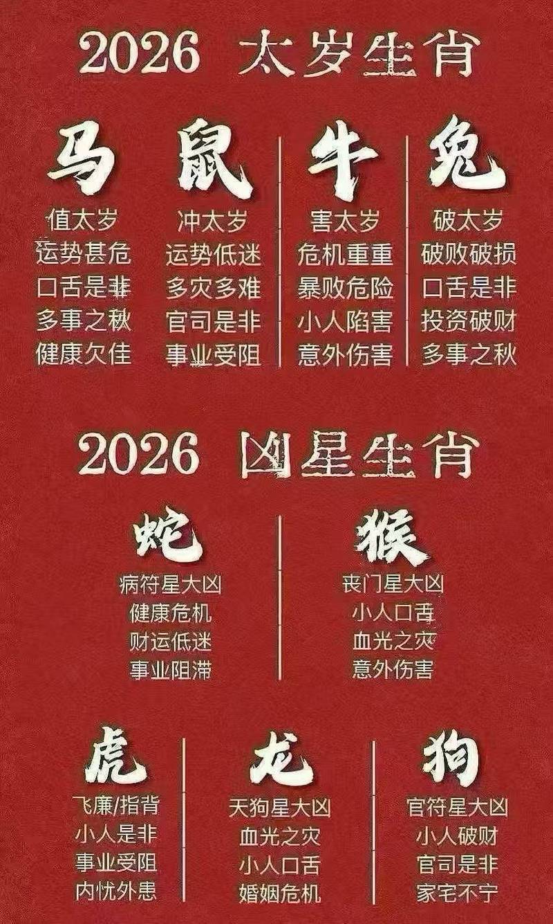 犯太岁生肖所经历的坎坷,本质上是命运在强制要求个人进行自我修正、属马人的本命年,是在考察其能否克制自负;属鼠人的冲太岁,是在测试其在剧变中的适应力;属牛人的害太岁,是在提醒其优化社交圈层;属兔人的破太岁,是在磨炼其处理细节、应对突发事件的韧性。