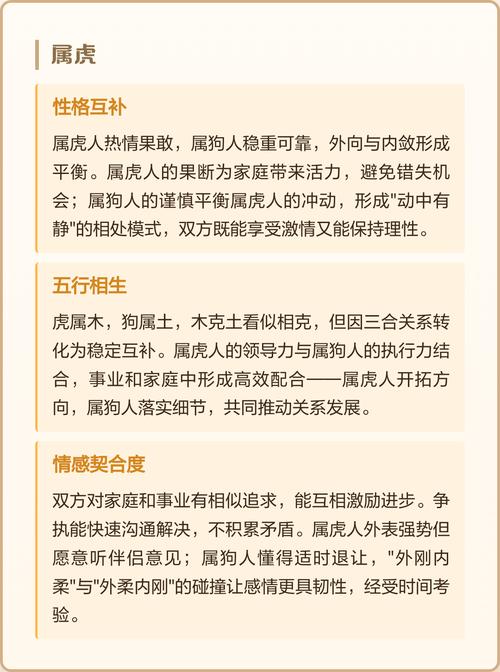 须知,地支之中,寅(虎)、午(马)、戌(狗)为三合火局、此局寓意彼此相吸,能共谋大事,相互成就、属狗之人忠诚、正直、守规矩;属虎之人则权威、勇猛、敢开拓、二者本应是绝佳的搭档,一主内,一主外,稳固与进取兼备。