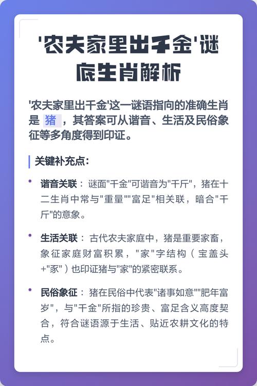在浩瀚的中华民俗文化里,关于生肖的说法总是充满了趣味与智慧、其中一句流传甚广的俗语“农夫家里出千金”,便寄托了人们对家庭兴旺、子女贤良的美好愿景、这句话并非空穴来风,它背后蕴含着深刻的农耕文化烙印与生肖命理的观察、那么,这句吉言究竟指向哪个生肖呢?