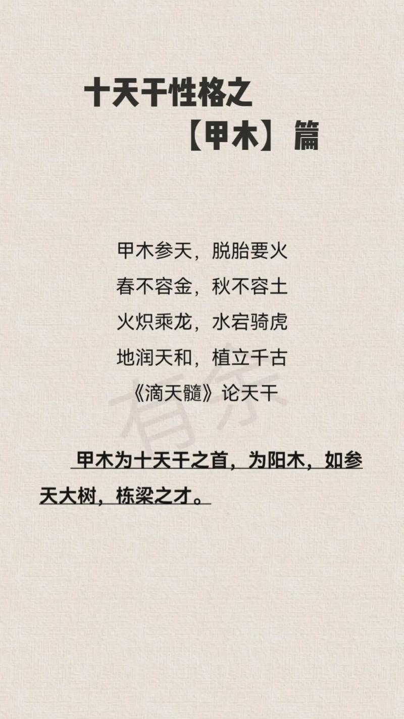 甲木位居十天干之首,在天为雷,在地为木、它是森林里的参天大树,性质刚健、正直,拥有一种向上突破、不屈不挠的原始生命力、研究甲木,必须首先建立起一个空间感:它不是盆栽,也不是杂草,它是需要时间成长、最终顶天立地的栋梁。