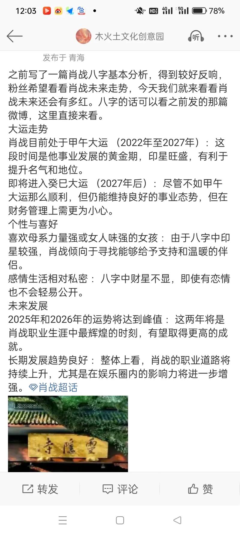 从干支逻辑来看,肖战八字中隐含的“寅申冲”(流年与日支的作用)在未来几年仍会间歇性出现,这意味着变动依然存在、但对于已经经历过风浪的戊土日元来说,这些变动已不再是阻碍,而是推动他向更高维度跨越的台阶。