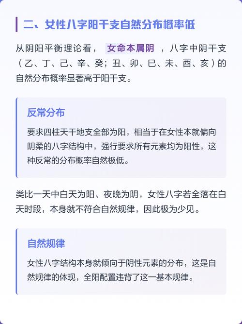 在命理学的长河中,阴阳平衡是贯穿始终的核心、所谓“孤阴不生,独阳不长”,讲的就是万事万物都要讲究一个和谐、对于女性而言,生辰八字本应以阴柔为基调,若四柱八字(年、月、日、时)的干支全属于阳性,即甲、丙、戊、庚、壬这五个阳干,配合子、寅、辰、午、申、戌这六个阳支,便构成了命理学上常说的“女命纯阳”、这种命格在女性身上出现,往往伴随着极强的个性张力和生命起伏,其背后的深意和对人生的影响,需要从性格、事业、婚姻、健康以及家运等多个维度细细拆解。