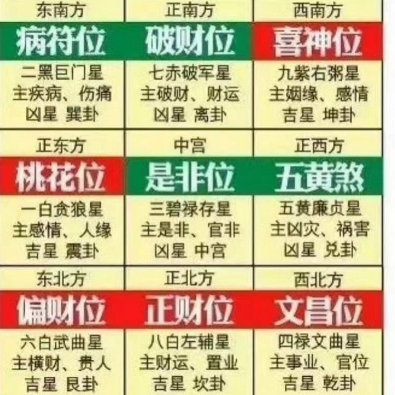 依据紫白决,一白入中,则各星顺飞九宫、我们可以得出以下方位分布,并结合八字喜忌给出对应的调整方案。