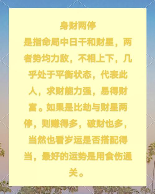 命理不是宿命论,而是一种能量管理的学问、身财两停给予我们的启示是:一个人想要承载多大的财富,首先要看自己有没有那个承载的底气和体量、如果你觉得自己现在赚钱很辛苦,甚至因为赚钱而身心俱疲,那说明你现在的“财”已经超过了“身”的负荷、这时候不应该盲目去追逐更多的财,而是应该停下来,通过修心、锻炼、学习来加固日主的根基。