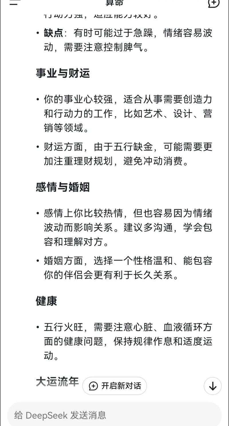 AI在处理丙午年的流年运势时,有着天然的优势、比如,当你输入自己的生辰八字,AI会瞬间完成“十神”的推演、如果你是庚金命人,遇到2026年的丙午火,那就是“官杀极旺”、AI会根据你八字中水的强弱,判断你这一年是被官杀克制得透不过气,还是能够“食神制杀”成就一番事业、这种逻辑推导,AI可以在毫秒间完成上万次模拟,给出你最可能遭遇的几种情况。