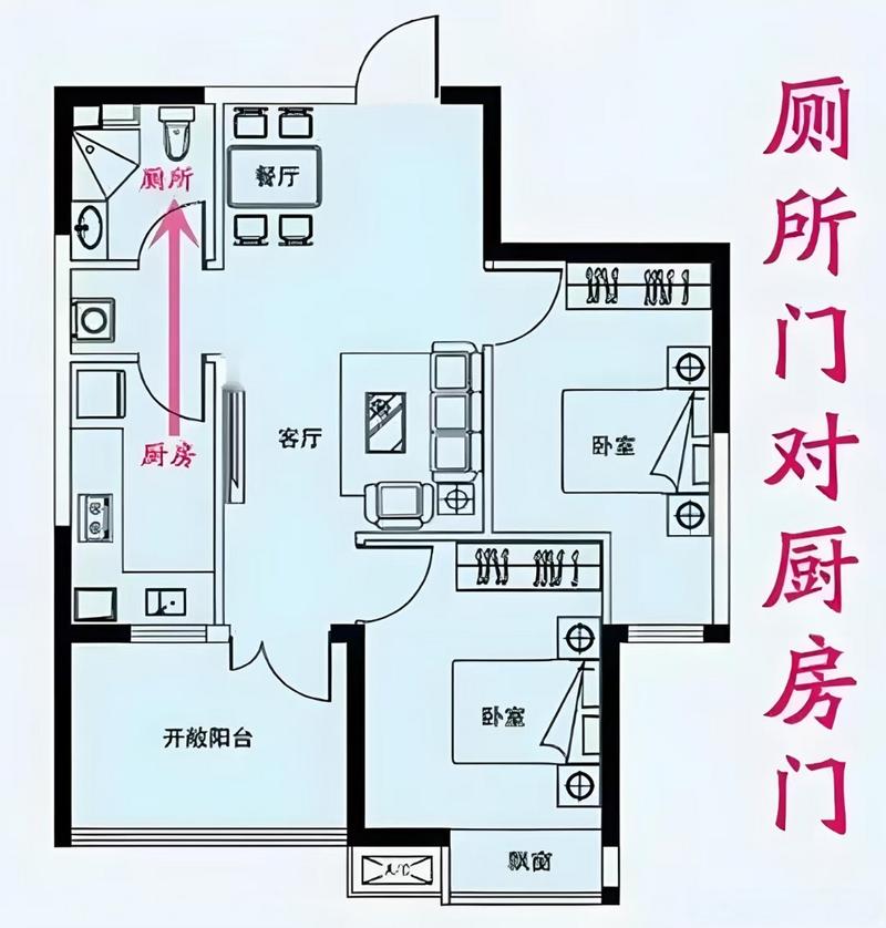 如果厕所门与厨房门正相对,这被称为“门冲”、气流在两门之间穿梭,将厕所的阴气直冲灶台、灶台是供奉“灶君”的位置,也是全家食禄的象征、秽气冲灶,意味着食不甘味,长久以往,家人的事业运势会大打折扣。