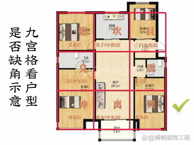 套格子的原则:面积不足该方位总面积三分之一的视为“缺”,超过三分之一的视为“实”、对于缺角,应在对应的墙面利用五行属性能量进行“借气补运”。