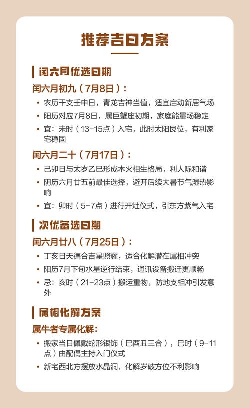 通过以上深度解析,属牛人在2026年6月的搬家选择上,应以“避火、合水、化害”为基本方针、择日虽是玄学,实则是寻求天时、地利、人和的契合点、在丁酉、庚子等吉日入宅,辅以正确的风水布局与传统仪轨,属牛人定能在马年这动荡的一年中,在新的家园里寻得一份安稳与兴旺。