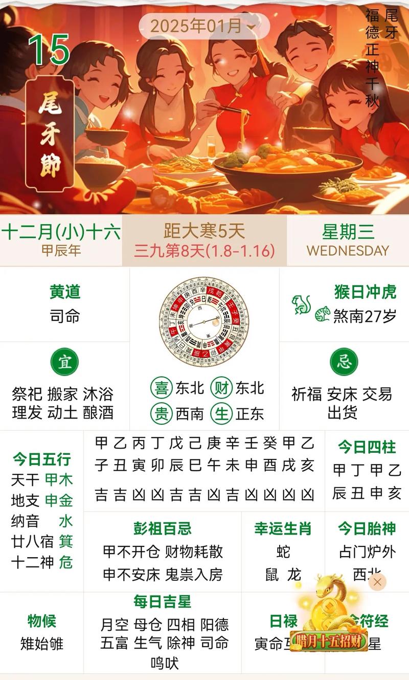 丙子纳音为涧下水、丙火代表小肠、心脏与眼目,子水代表肾脏、膀胱与耳、当日水火相战,最需预防的是心肾不交、腊月寒气深重,丑土当令,寒湿之气极重、对于平日里有心脑血管隐患的老年人,腊月十六是一个“坎儿”、水气过旺压制丙火,容易诱发心悸、失眠或者是突发性的血压波动。