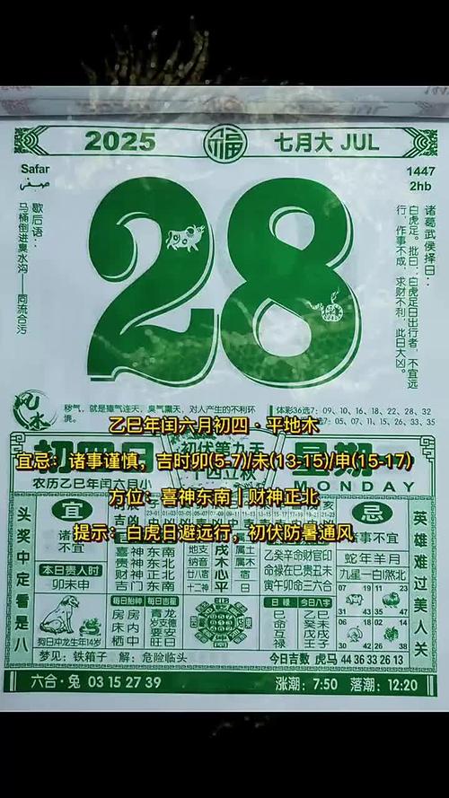 具体到2025年7月28日,农历六月廿三,这一天是“己巳日”、己巳日,天干己土与地支巳火相生,本是吉日、对于属龙的人来说,他们的生肖属辰,与当年的太岁(2025年为乙巳年,太岁为乙巳)既有冲也有合、乙巳年的太岁属火,而龙年出生者的辰土,在五行上,辰土克制太岁的木(乙木),但同时辰土又与太岁的巳火形成“辰巳相合”、这种复杂的五行关系,使得2025年7月28日这一天,对于属龙的人来说,吉凶参半,需要谨慎对待。