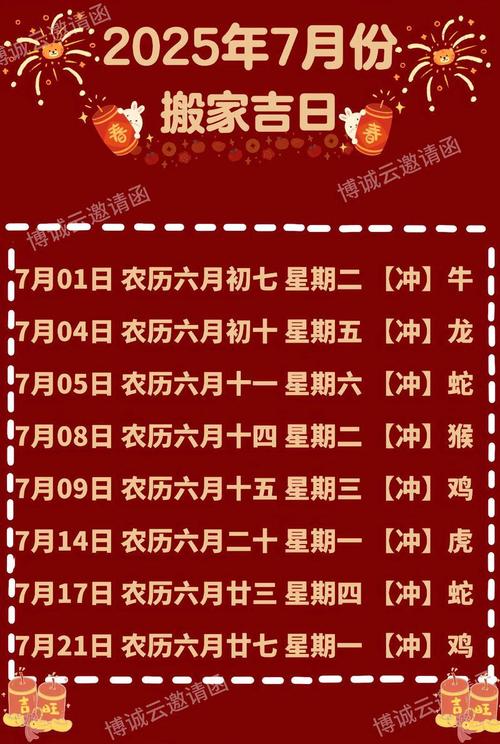 七月,正值小暑大暑节气之间,火土相生,阳气鼎盛、此时行事,若能得天时之助,则如顺水推舟、然择日之学,并非简略翻阅,需结合个人生辰八字,方为万全、此处所列吉日,乃为通用之选,供大众参考。