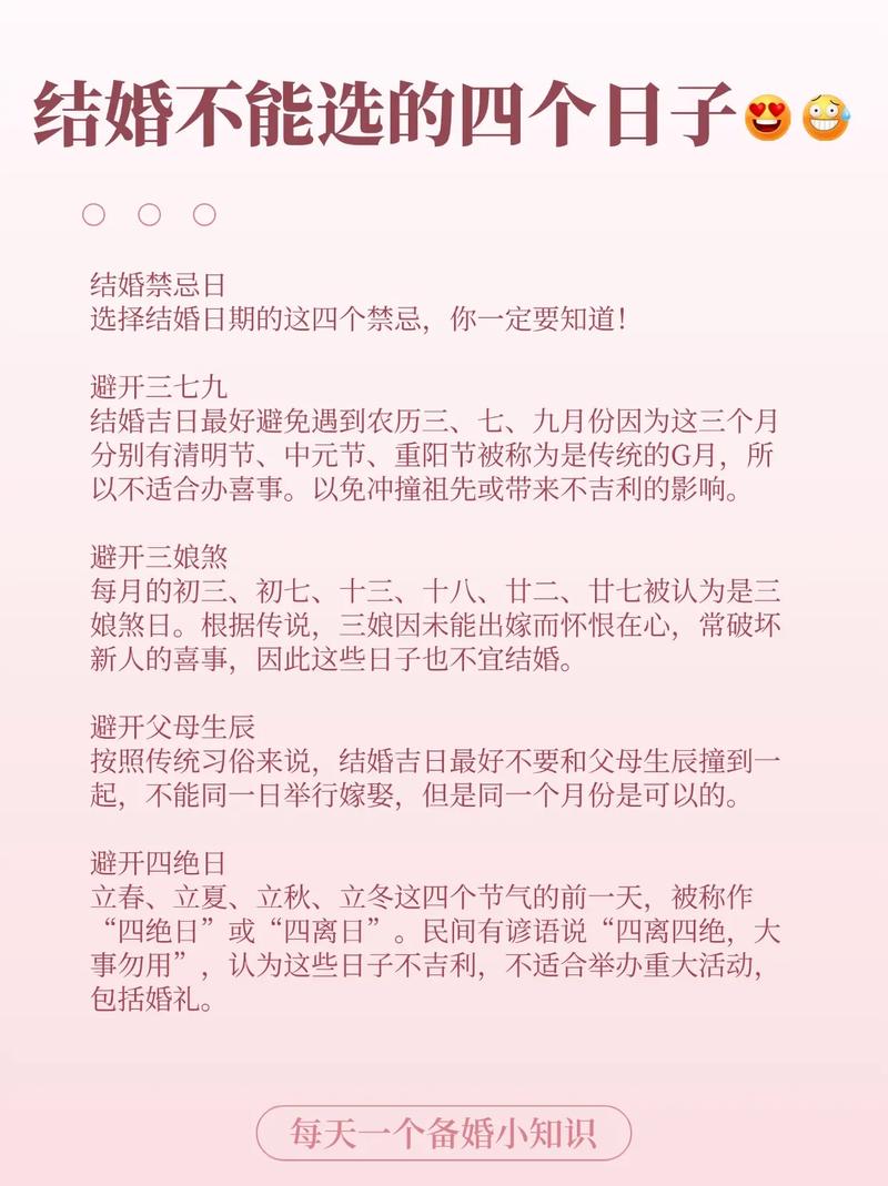 还要警惕“四离四绝日”、这些日子是节气交替的边缘,气场极度不稳定、在2026年这种火性年份,气场的动荡会更加剧烈、选在这些日子结婚,婚姻容易无疾而终,就像气场断裂了一样,无法持续。