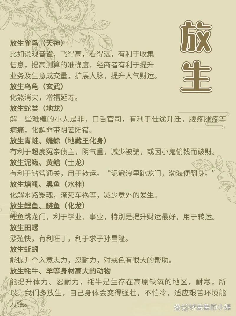 仪轨之心:放生非仅是简单的“一放了之”,重在过程中的发心与祝愿、仪轨可简可繁,核心在于为其念诵三皈依,令其种下佛法种子,脱离畜生道后,得闻佛法,终得解脱、可念诵“皈依佛,不堕地狱、皈依法,不堕饿鬼、皈依僧,不堕畜生、”三遍,再念佛号或往生咒为其加持、整个过程,心怀慈悲与忏悔,视其为过去父母,未来诸佛。