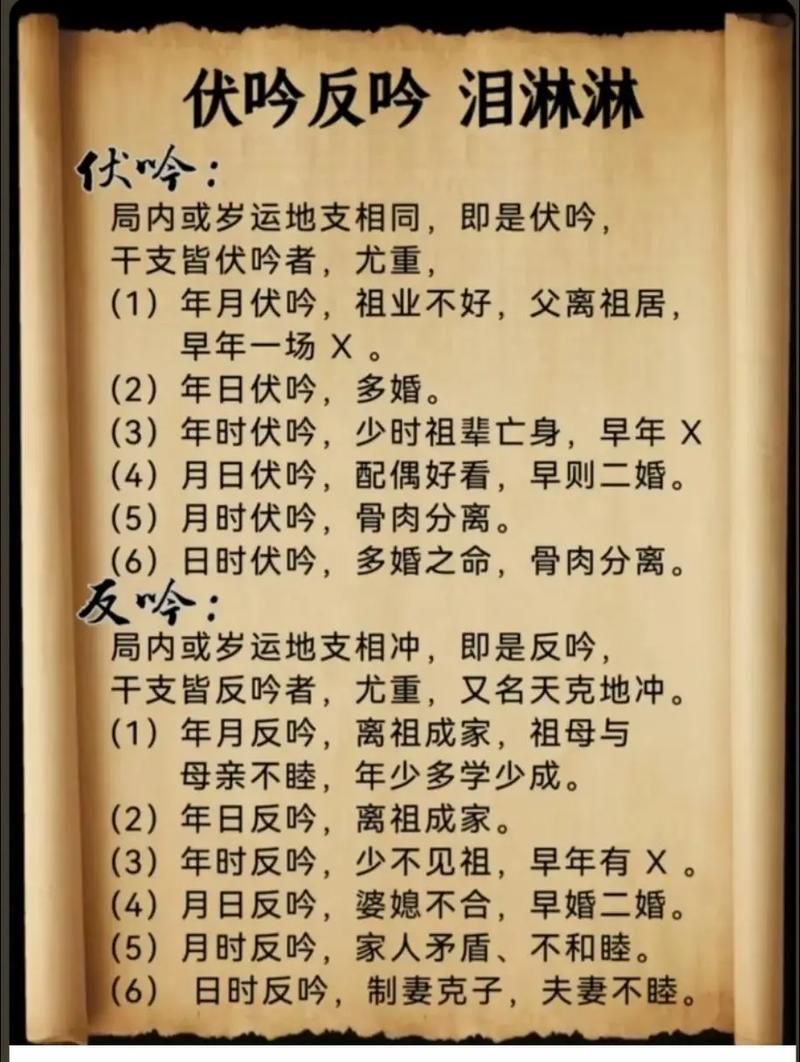日柱伏吟,直接作用于个人身体与配偶关系、这是最令人煎熬的一种、内心极度敏感、焦虑,容易钻牛角尖、夫妻之间可能并没有大吵大闹,但那种冷战般的压抑感会贯穿始终。