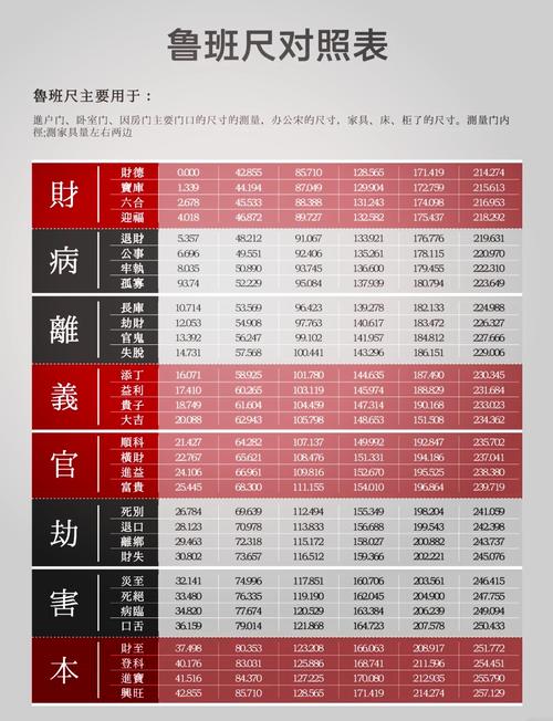 鲁班尺通常分为上下两层:上层为“公制/市制”单位,下层则是“财、病、离、义、官、劫、害、本”八个字、这八个字代表了八种能量场,每个字下又细分为四个小格、在进行室内装修或购置家具时,必须严格规避“黑字”区间(病、离、劫、害),转而追求“红字”区间(财、义、官、本)。