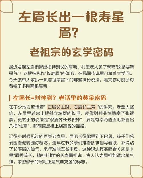 我们要明白,任何面相特征都是一种可能性的暗示,而非绝对的定论、左眉白毛的存在,是提醒我们在火旺之年,既要有火的热情,也要有金的冷静与白色的纯粹、在接下来的日子里,多关注自己的肝胆健康,多行善积德,这根白毛所承载的吉兆定会成真,而其预警的凶险自然会消散于无形之中。