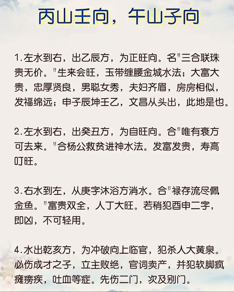 1. 若水口在“乙辰、巽巳、丙午”方位,这是水局的墓绝位,主财源滚滚,家族人丁兴旺。
