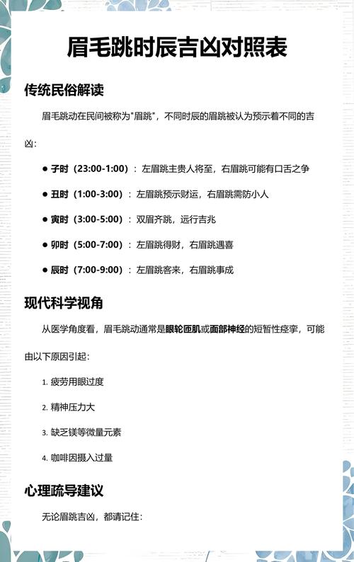 火主血脉、2026年由于气候与磁场偏燥,人体容易出现内分泌失调或神经紧绷、从玄学角度看,这种物理上的“抽动”实际上是人体微电场与流年大磁场摩擦的结果、如果你的五行喜火,那么在夏季(农历四、五、六月)的眉跳多为吉兆;若你五行忌火(如八字金水旺者),则需格外警惕任何时辰的右眉跳动。