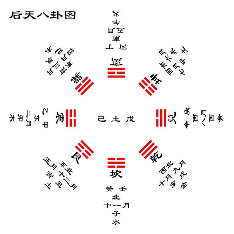 后天八卦将空间划分为八个维度,每个维度对应一个卦象、一种五行、一个家族成员以及人体脏腑。