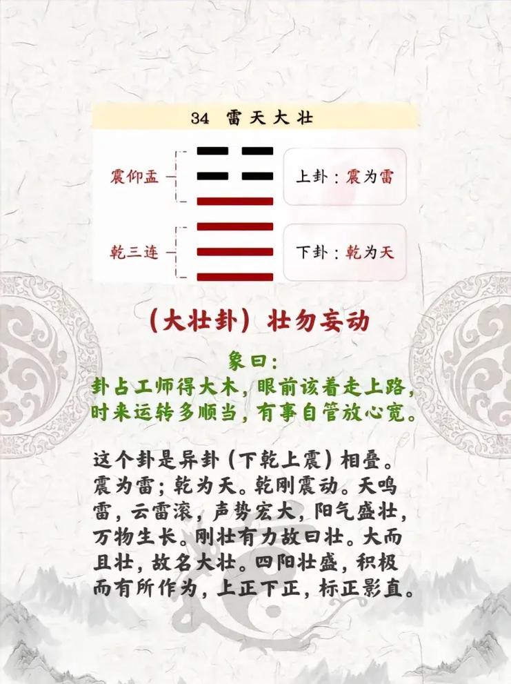 震卦居上,动也;乾卦居下,健也、外动而内健,意味着一个人内部蓄积了深厚的能量,并开始向外爆发、大壮卦四个阳爻在下,两个阴爻在上,阳气已经越过中位,向上挺进,这是一种势不可挡的发展趋势。