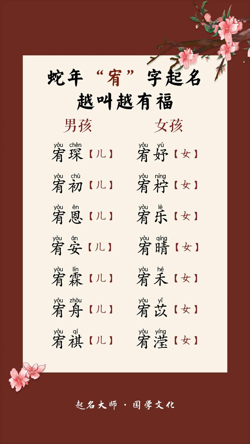 春季出生(寅、卯月): 春木生火,火势已露头角、此时用“宥”字,土属性可以吸收过剩的木气与火气,是非常稳妥的选择。