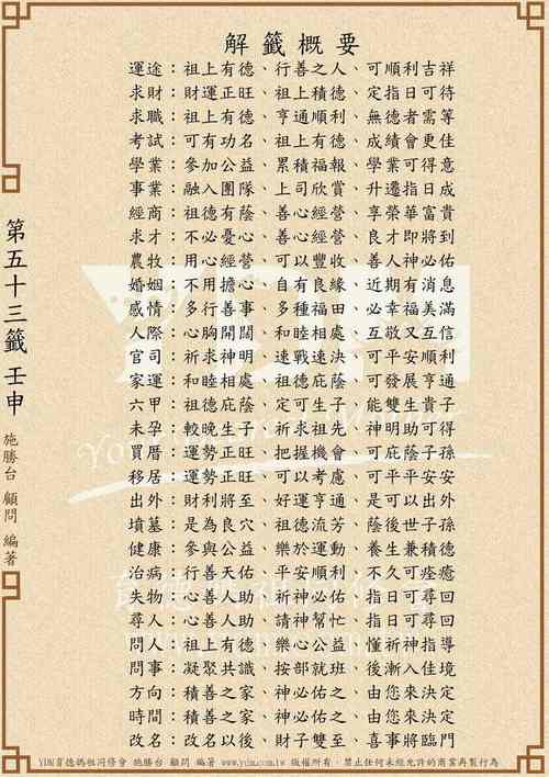 大师解签:今年正逢运势的关口,心浮气躁只会越弄越乱、很多事情不是靠聪明才智就能解决的、建议保持低调,行善积德,不要求快、生意上防范资金链断裂、感情上忌讳相互猜疑。