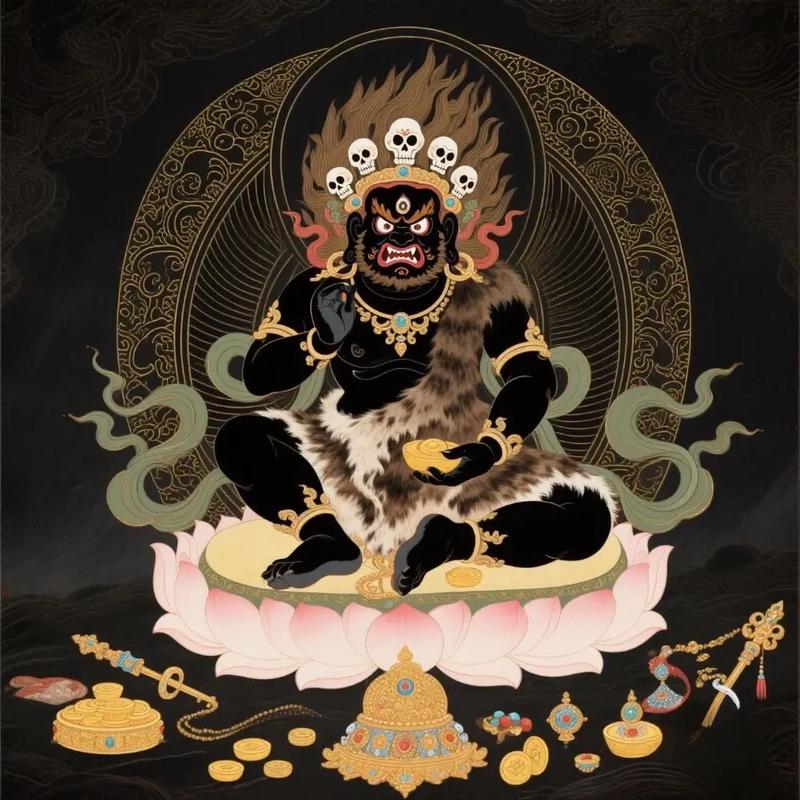 黑财神,梵名“藏巴拉奢那”,是东方金刚不动佛的化身、在密宗体系里,他不仅仅是五姓财神之一,更是专门消除怨敌、偷盗、病魔等障碍的权威、对于现代城市居住环境而言,所谓的“灵异”现象,本质上是家宅中积聚了过多的“阴邪煞气”或“负性能量信息团”、2026年火气过旺,这种燥热的气场极易惊扰到原本潜藏在暗处的阴性物质、而黑财神法相威猛,全身赤裸,怒目圆睁,右手持骷髅血器,左手握吐宝鼠,脚踩贪婪之王、这种战神式的、具有极强威慑力的法相,对于游离在空间中的低频率灵体具有极强的震慑效果。