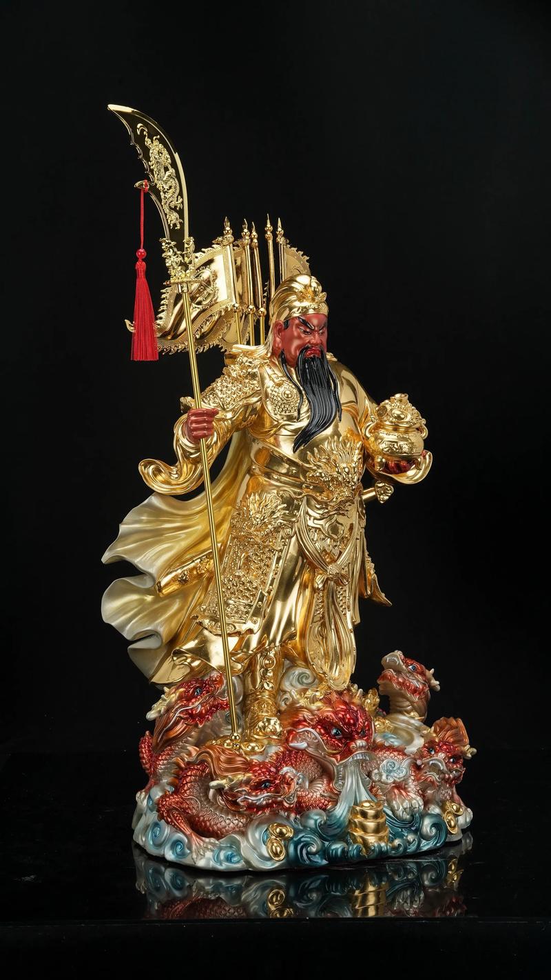 关公像的青龙偃月刀通常是分体设计的、在安装时,务必确保刀杆握紧在关公手中,不能有晃动、若刀杆歪斜,寓意财源不稳,办事易出差错。