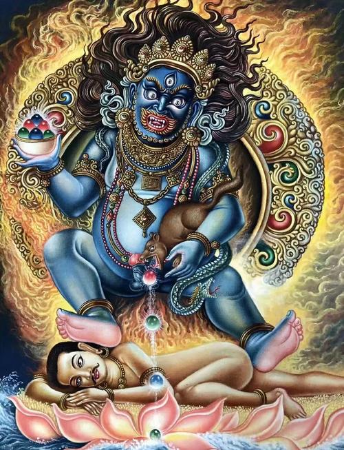 关于“脚踩女人”的视觉争议,首先需要正本清源、在正统的藏密经续记载中,黑财神脚下所踩踏的并非普通的世俗女性,而是一个侧卧的黄色人物、这个人物在经典中被称为“居明”或“财主”,也有说这是“贫穷之神”或“欲界中的悭吝魔”、这个形象之所以看起来像女性,是因为其姿态柔软、身体丰腴,且在某些艺术流派的唐卡画工中,线条处理得较为柔和。