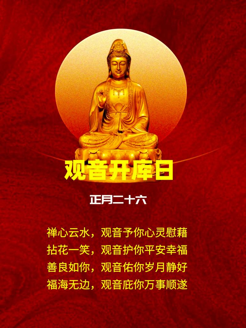 农历正月二十六,是民间流传极广的“观音开库日”、据传隋唐年间,五百罗汉为了考验观世音菩萨的修行,化身为僧人前往观音庙讨斋、观音菩萨大开仓库,不仅让僧人们饱餐,还将余下的食粮分发给百姓、自此,民间便有了这一天向菩萨“借库”的习俗。