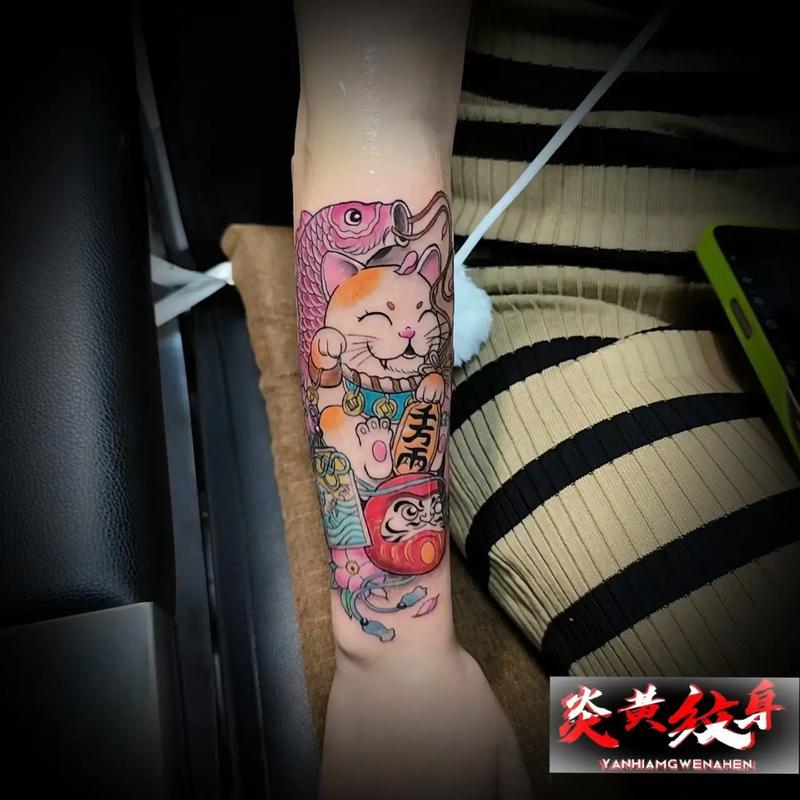 如果财神猫的配色以大红、亮金为主,在2026年可能会导致纹刺者性格变得急躁,容易发生口舌是非、建议在色彩中适量加入黑色(水)或深蓝色,以达到“水火既济”的平衡、猫的眼睛建议点缀以翠绿色(木),木能生火,亦能化解暴戾之气,使财源流转更加顺畅。