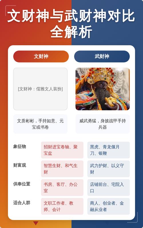 武财神则以赵公明(赵公元帅)和关圣帝君(关羽)为代表、赵公明黑面浓须,骑黑虎,手持银鞭,职掌天下财源,其特点是速度快、力度大,尤其对偏财、横财、意外之财有极强的催动作用、关公则威风凛凛,分持青龙偃月刀的“文关公”与“武关公”,其核心能量场趋向于“攻”与“御”,既能开辟财路,又能镇宅辟邪、防范小人暗算。