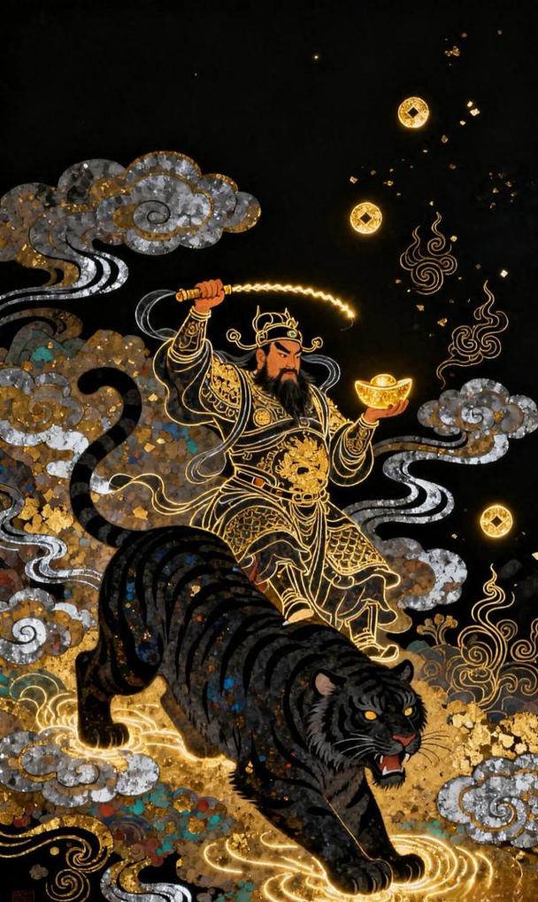 其三,黑虎的动态、赵公明座下的黑虎,象征着能够驾驭的原始力量、2026年是马年,马与虎属于“三合”关系、这意味着在这一年,武财神与岁君的关系相对和谐、黑虎的头若微偏向财神的一侧,寓意忠诚护主;若黑虎张口咆哮,则增强了招偏财、压外邪的力量。