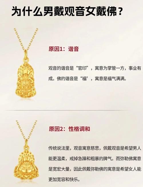 商人或职场人士更适合佩戴持经观音或持莲观音、持莲观音象征出淤泥而不染,能保佑在复杂的商场中保持清醒,不被贪念左右、忌讳佩戴那些神态忧郁或线条模糊不清的廉价金饰,观音的面相必须圆满、慈祥、如果金观音的眼睛部位刻画得不对称,或者嘴角向下,这种法像不仅不能带来福气,反而容易让人心情压抑。