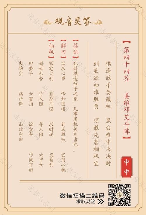 2026丙午马年,岁次属火,气场燥烈且动荡、这一年的职场环境如同烈火烹油,机会虽多,但竞争之惨烈亦是前所未见、抽得观音第四十四签,问及事业前程,其核心机理在于一个“藏”字与一个“守”字、当下的职场运势正处于博弈的胶着期,犹如两位顶尖棋手对弈,棋盘之上杀气腾腾,每一招每一式都牵动全局。