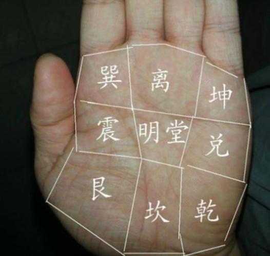 倪氏手相法中,八卦方位的判断是进阶之术、手掌被分为乾、坎、艮、震、巽、离、坤、兑八宫。