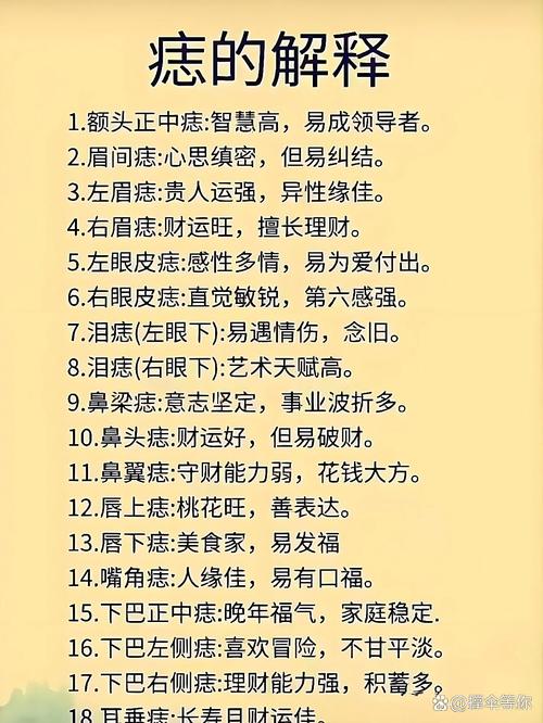 风水相学从来不是孤立存在的、面相上的痣,色泽至关重要、朱砂痣(红痣)在唇上通常代表贵人运与才华;纯黑如漆的痣代表能量内敛,往往是实业家的特征;而灰色、灰褐色且边缘模糊的痣,则被称为“死痣”,往往带有负面暗示。