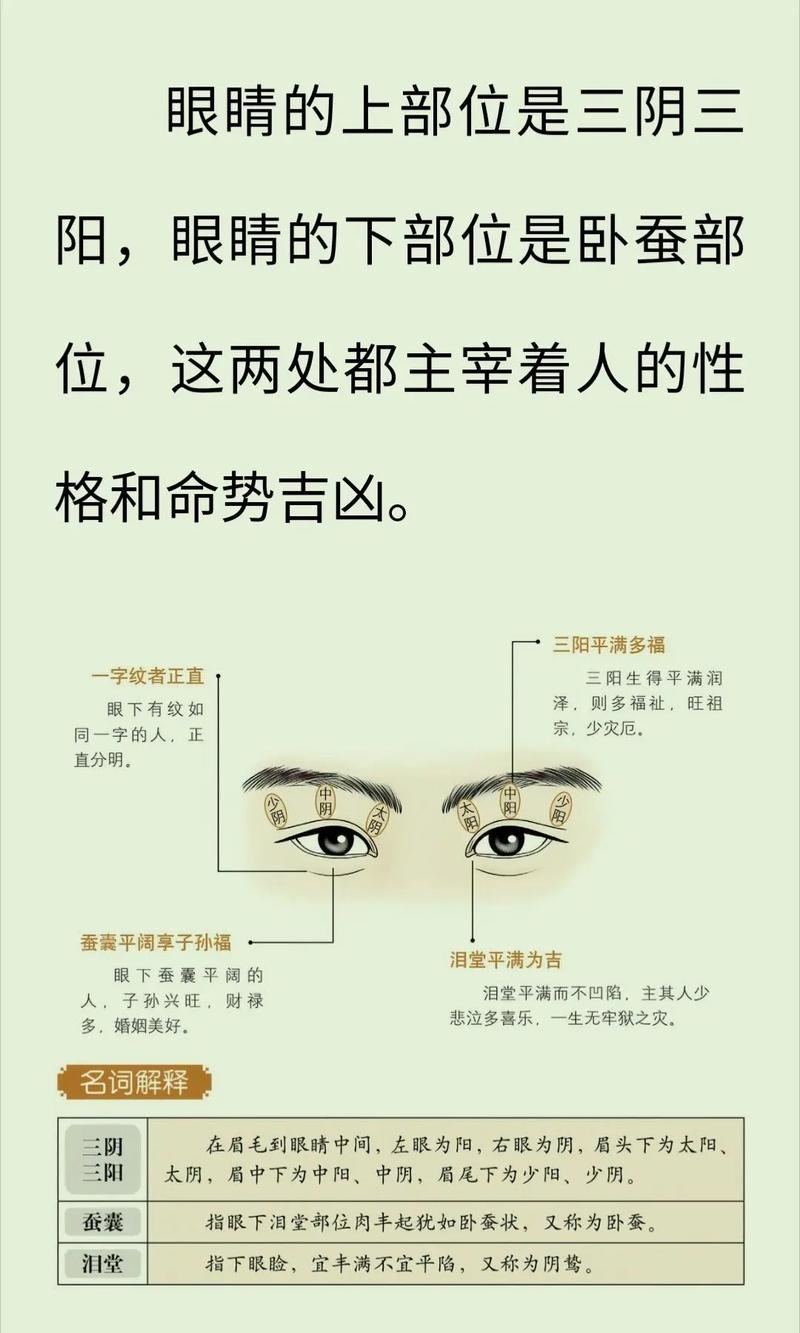 很多人分不清眼下这方寸之地的具体划分、在面相体系中,三阳部位指两眼之下,也就是卧蚕位,古人称之为“龙宫”、这里不仅主导生育与后代,更象征个人的肾气盈亏、而三阴,则位于三阳之下,靠近面部颧骨上缘的阴影处,它是肾气外露的终端。