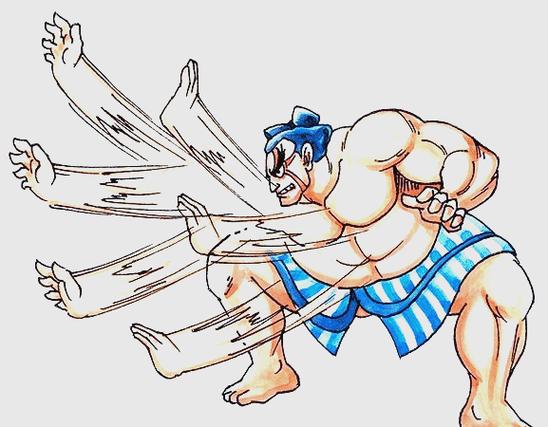 为了更深入地理解本田,我们需要将他与其他角色对比、比如隆(Ryu)属“水”,因为他追求的是流动的波导;而本田则绝对属于“土”,因为他追求的是绝对的防御与反击。