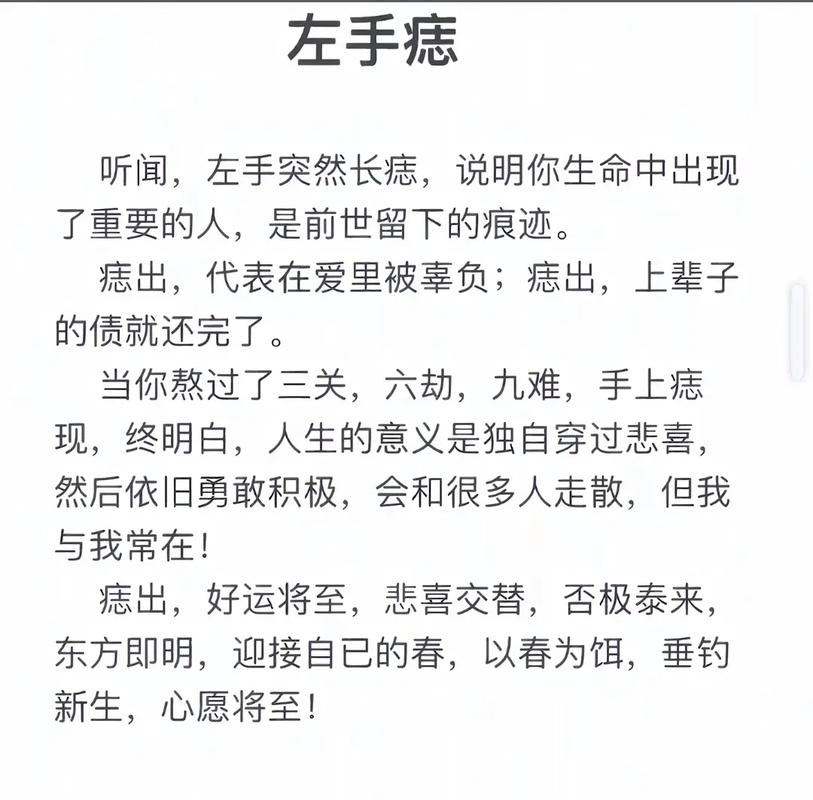 3. 心态建设: 痣相本质是个人心理特质的映射、左手痣多的女性,往往心事较重、学会“左进右出”,即善于接收他人的建议,同时也要懂得释放压力,才能真正发挥出痣相带来的福气。